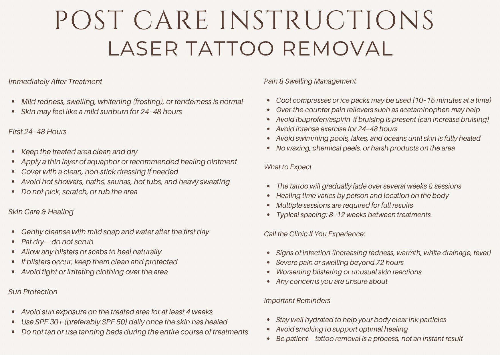 Typical course: ~3-10+ sessions (varies by ink density/colours). Downtime: Swelling/frosting right away; then tenderness; aftercare is key.